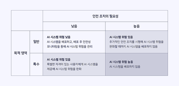 한편 세계적으로 AI 안전에 대한 법제화 움직임이 이어지며 개별 기업의 AI 안전성 확보의 중요성은 갈수록 높아지고 있다. 대표적으로 유럽연합은 지난 3월 세계 최초로 AI의 위험성을 관리하는 법안인 인공지능법을 통과시켰다. 해당 법안은 AI를 위험성에 따라 등급을 분류하고, 고위험으로 분류된 AI는 엄격하게 관리하는 것이 골자로, 해당 법을 위반하는 기업은 최대 전 세계 매출의 7%를 과징금으로 부과받게 된다.