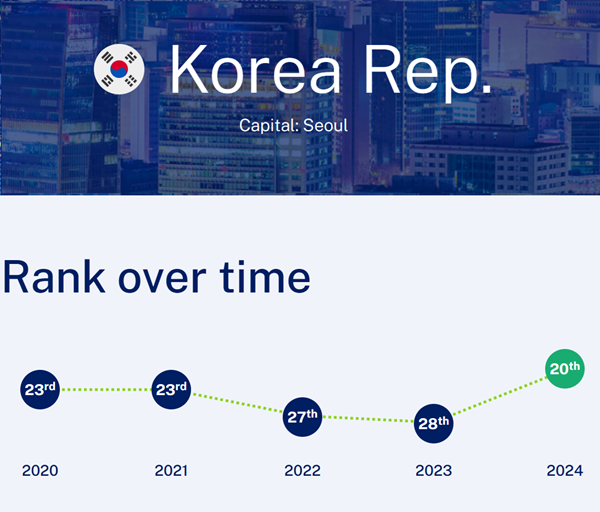기획재정부에 따르면, IMD가 지난 18일 발표한 2024년도 국가경쟁력 평가에서 한국은 67개국 중 20위를 차지하며 순위가 지난해보다 8계단 상승했다. 이는 한국이 지난 1997년 평가 대상에 포함된 이후 가장 높은 순위로, 30-50클럽(국민소득 3만 달러 및 인구 5천만 이상 국가) 중에는 미국에 이어 2위에 해당한다.