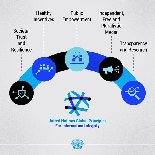 이에 유엔은 그 해결책으로 정보 무결성 글로벌 원칙을 발표하게 되었으며, 해당 원칙은 ▲사회적 신뢰와 회복력 ▲독립적이고 자유로우며 다원적인 미디어 ▲건전한 인센티브 ▲투명성과 연구 ▲대중의 역량 강화 다섯 가지 원칙을 기반으로 세워졌다.
