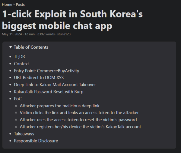 화제가 된 제보자는 독일인으로, 지난달 31일 자신의 블로그에 해당 취약점을 발견하고 이를 카카오에 제보한 과정에 대해 공개했다. 공격자가 상대방에게 링크를 보내면 상대방의 카카오 메일 계정을 탈취하고 비밀번호를 재설정할 수 있는 취약점으로, 제보자는 지난해 12월 카카오에 이 취약점을 보고했으나, 한국 국적자만 현상금을 받을 수 있어 결국 아무런 보상도 받지 못했다고 밝혔다. 한편 카카오는 패치를 통해 해당 취약점에 대한 대응을 완료한 상황이다.