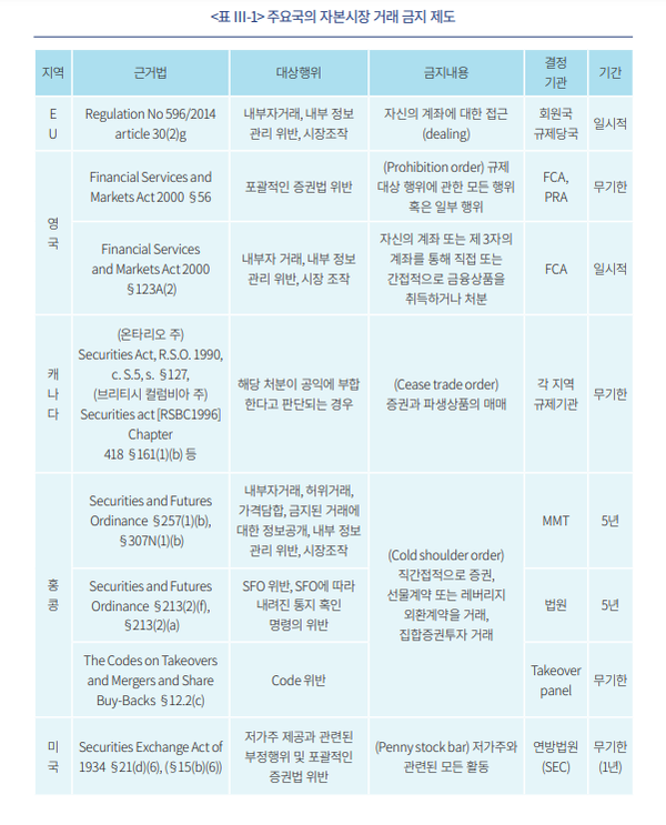 보고서를 작성한 정수민·황현영 자본시장연구원 연구위원은 “거래제한제도 또한 EU, 캐나다, 홍콩 등 해외 주요국에서 도입돼 이용되고 있으며, 국내에서도 불공정거래 전력자에게 10년간 주식 등 신규 거래 및 계좌 개설을 제한하는 자본시장법 개정안이 국회에 발의된 상태”라고 설명했다.