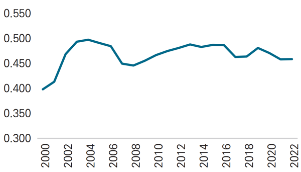 물론 반도체처럼 상대적으로 한·일 수출경쟁이 심한 산업도 있지만, 한국의 비교우위가 확실한 만큼 엔저 영향은 크지 않을 것으로 보인다. 실제 반도체 산업의 한·일 수출경합도는 지난 2017년 0.498에서 2022년 0.530으로 상승하며 전 산업 평균치(2022년 기준 0.458)를 상회했지만, 오히려 이 기간 한국의 반도체 수출은 평균적으로 증가하는 추세를 보였다.