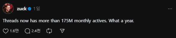 마크 저커버그 메타 CEO는 4일 게시글을 통해 스레드가 1년 만에 월간 활성 이용자(MAU) 1억 7,500만 명을 돌파했다고 밝히며 “정말 대단한 한 해였다.”라고 말했다. 그의 발표는 스레드가 출시 1주년을 맞이하는 시점에 올라왔다.