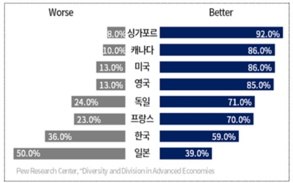 이주민들의 성공적인 정착을 위해선 우리 사회의 시선도 바뀌어야 한다는 지적도 있다. 미국 싱크탱크 퓨리서치센터의 2021년 인식조사를 보면, 독일은 국민의 71%가 이주 배경자의 다양성을 긍정적으로 인식했다. 한국 59%로 하위권에 머물러 있다.