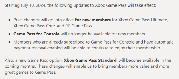 게임 패스 코어의 연간 구독 요금 역시 46,800원에서 58,500원으로 인상된다.또 새로운 중간 단계 요금제인 엑스박스 게임패스 스탠다드가 신설된다. 다만 스탠다드에는 클라우드 기능과 독점작 데이원 게임 제공이 사라지며 이용자들 사이에서는 사실상 가격은 오르면서 혜택은 더 줄어들었다는 비판이 나온다.