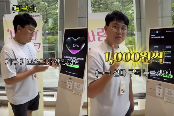 최근 기부 키오스크와 관련해 LG전자 직원 영상이 화제가 되고 있다. 유튜브 채널 ‘MZ전자’를 운영하는 LG전자 최정현 선임은 지난 4일 구독자 1명당 1000원을 기부하겠다며 사내 기부 키오스크를 사용하는 영상을 올렸다. MZ전자의 기부 공약은 44만여 명의 구독자를 보유한 테크 유튜브 채널 ‘뻘짓연구소’의 눈에 띄었고, 그는 커뮤니티 게시판에 기부를 통한 ‘담당자의 월급삭제’를 제안했다. 이후 구독자들이 몰려들기 시작했다.