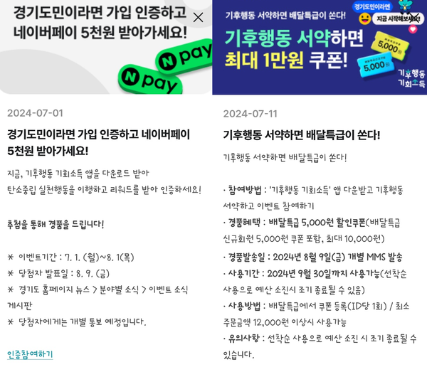현재 네이버, 공공배달앱 배달특급과 정식 앱 출시 이벤트도 하고 있다. 기후행동 기회소득 앱을 다운받고 마이페이지를 캡쳐하여 가입 인증하면 추첨을 통해 210명에게 밀폐용기, 머그컵, 네이버페이 5000원 등의 경품을 지급한다. 배달특급은 5000원 할인쿠폰을 지급한다. 다음달 9일에 개별MMS로 발송하며, 선착순 사용으로 예산 소진시 조기 종료될 수 있다.