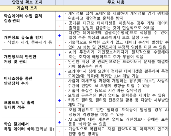 개보위는 인공지능 기업이 모든 안전조치를 의무적으로 시행해야 하는 것은 아니며 안내서에 제시된 여러 안전조치의 순기능과 인공지능 성능저하, 편향성 등 부작용과, 기술 성숙도를 고려해 기업의 특성에 맞는 안전조치의 최적 조합을 스스로 선택해 이행할 수 있다고 밝혔다.