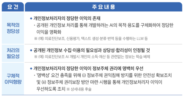 먼저 보호법 제15조에 따른 ‘정당한 이익’ 조항에 의해 공개된 개인정보를 AI 학습·서비스 개발에 활용할 수 있다는 점을 분명히 했으며, 이러한 ‘정당한 이익’ 조항을 적용하기 위해서는 AI 개발 목적의 정당성, 공개된 개인정보 처리의 필요성, 구체적 이익형량이라는 세 가지 요건을 충족해야 한다고 명시했다. 개인정보위는 이번 안내서를 통해 세 가지 요건의 내용과 적용사례도 안내했다.