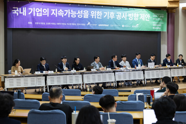 지난 22일 국내 환경·사회·지배구조(ESG) 경영을 촉구하는 단체(그린피스, 녹색전환연구소, 경제개혁연구소, 한국 사회책임투자포럼)와 국가인권위원회, 민병덕 의원실 등은 국회의원회관에서 ‘국내 기업의 지속가능성을 위한 기후공시 방향 제안’ 토론회를 개최했다.
