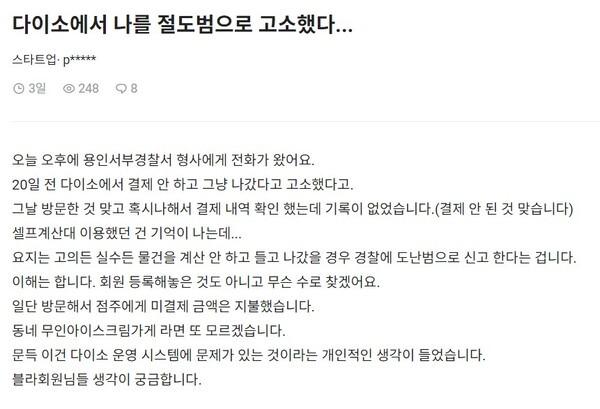 얼마전 블라인드에 올라온 글에 의하면 A씨는 20일 전 다이소에서 무인계산대를 이용한 결제에서 실수로 금액이 지불되지 않았고, 이를 인식하지 못한 채 나왔다. A씨는 “이 후 경찰서에서 고소가 들어왔다는 전화를 받았다”라며 “고의든 실수든 물건을 계산하지 않고 나갔을 경우 도난범으로 신고하는 다이소 운영시스템에 문제가 있는 것은 아닌가”라고 말했다. 무인계산대로 일어나는 리스크를 공권력으로 해결하고자 한다는 문제를 제기한 것이다.